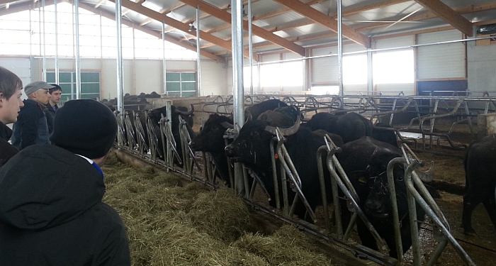Auf dem Hinweg stellte ein Studierender den elterlichen Betrieb vor. Seine Kommilitonen konnten sehen, wie es funktioniert, wenn ein Teil des Betriebs ökologisch und der andere konventionell geführt werden, da der Betrieb aus zwei räumlich getrennten Hofstellen besteht. Die Klasse besichtigte den angeschlossenen Hofladen sowie den neuen „Regiomat“, einen Lebensmittelverkaufsautomaten für Kunden des nahe gelegenen Wanderwegs. Die Hauptattraktion war aber der neu gebaute Büffelstall, in dem alles etwas größer dimensioniert war als in üblichen Milchviehställen.