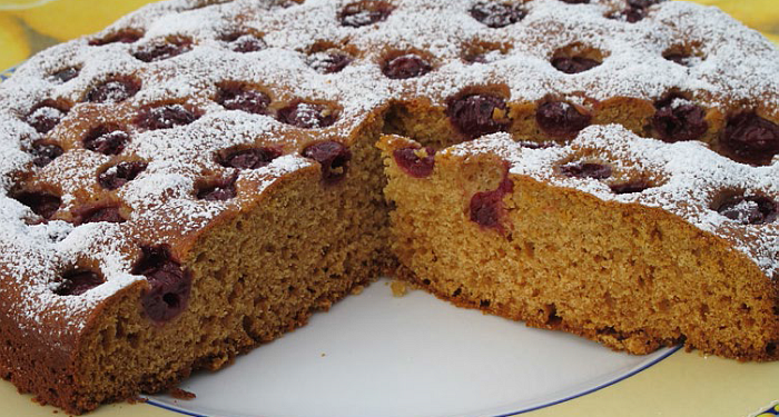 Die Butter mit Honig schaumig rühren, Eigelb unterrühren. Mehl mit Backpulver mischen, nach und nach mit der Milch dazugeben. Zuletzt das steifgeschlagene Eiweiß unterheben. Den Teig in eine gefettete Form füllen, die Kirschen darauf verteilen und leicht eindrücken. 60 Minuten bei etwa 1600C backen.