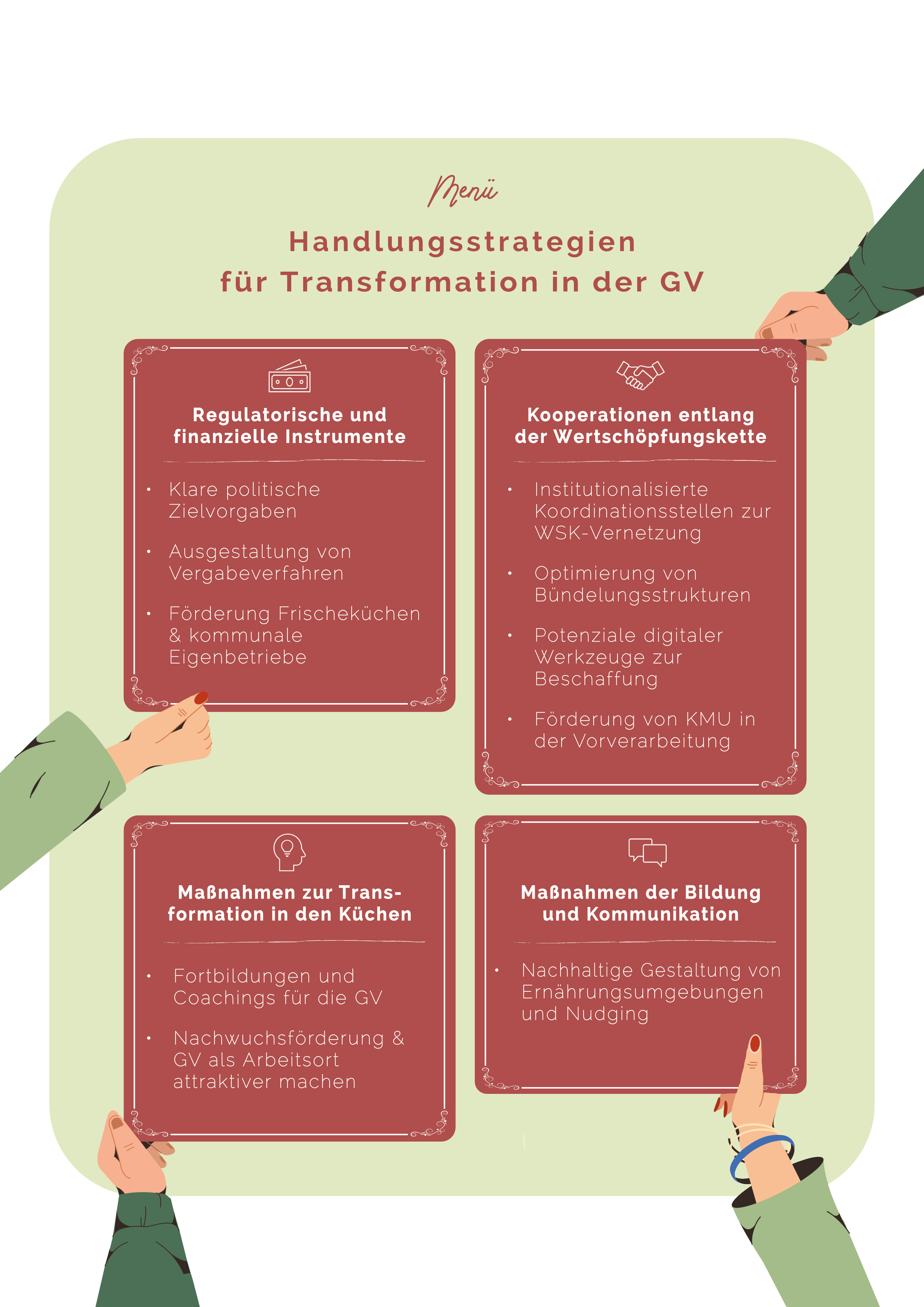 Die auf einem Stakeholder-Workshop diskutierten Handlungsmaßnahmen umfassen regulatorische und finanzielle Instrumente, Maßnahmen zur Kooperation entlang der Wertschöpfungskette und zur Transformation in den Küchen sowie Maßnahmen der Bildung und Kommunikation.