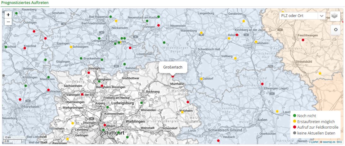 Das Gute an der Prognose ist, dass auf einer Karte das wetterdatenbasierte Prognoseergebnis dargestellt wird und, dass man durch einen einzigen Klick seinen Standort für eine schlagspezifische Berechnung auswählen kann. Die Berechnungen gelten dabei immer für den konkreten Schlag, auf dem ein Erstauftreten der Eigelege festgestellt wurde. Der Start der Prognose erfolgt dann genau ab dem Tag an dem das Erstauftreten von Eigelegen ins System eingegeben wird.