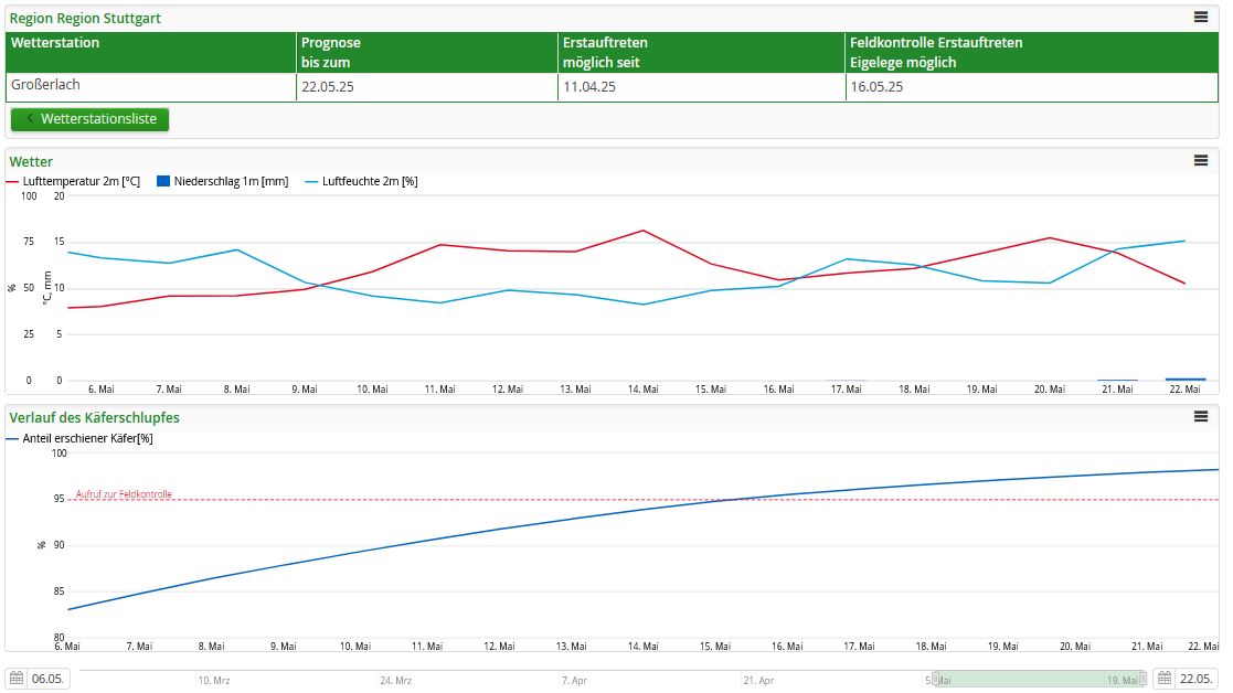 - Rot = Es sollte eine Feldkontrolle auf erste Eigelege durchgeführt werden (95% erschienene Käfer)