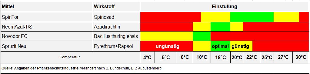 Praxistipps: Die optimale Anwendung der biologischen Präparate erfolgt in den Abendstunden und nach dem täglichen Bienenflug, um die volle Wirkung der meist lichtempfindlichen Präparate zu nutzen. Auch bei der biologischen Bekämpfung sind Minderwirkungen bei hochsommerlichen Temperaturen bei Pflanzenschutz-Anwendungen um die Mittagszeit nicht auszuschließen sondernr eher zu erwarten, da die Spritzbeläge zu schnell antrocknen und die Wirkstoffe dann ggf. nicht eindringen bzw. sich nicht ausreichend in den Pflanzenteilen verteilen können.