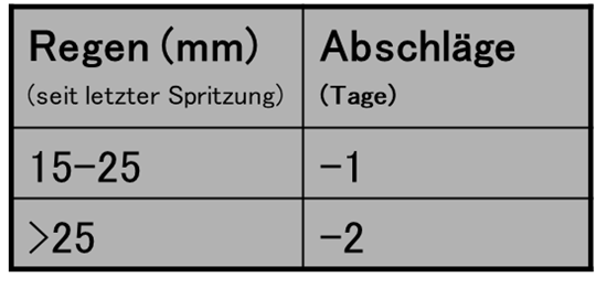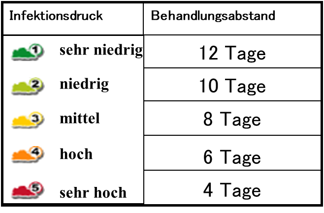 Durch die Eingaben zu Niederschlag und Krautwachstum kann sich der Behandlungsabstand um bis zu 1 Tag verlängern bzw. um bis zu 3 Tagen verkürzen. Die Möglichkeit einer Spritzpause wird bei andauernden ungünstigen Krautfäulebedingungen empfohlen.