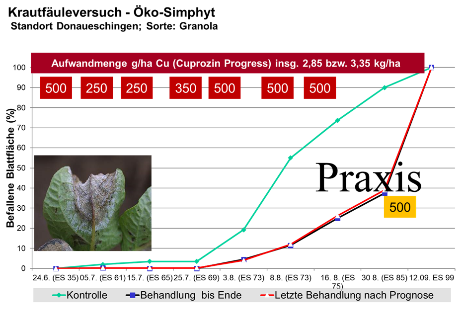 - Das u.a. Donaueschinger Ergebnis verdeutlicht einmal mehr, dass das Prognosesystem Öko-SIMPHYT als wichtige, schlagspezifische Entscheidungshilfe zur gezielten Terminierung von Kupferpräparaten gegen die Kraut- und Knollenfäule geradezu prädestiniert ist, den Kupfereinsatz gezielt zu steuern um die Gesamtmenge zu reduzieren. Aufgrund des infektionsdruckbasierenden Spritzabstandes wurde die Bekämpfung der Phytophthora in der Versuchsreihe optimiert und der Einsatz kupferhaltiger Fungizide - ohne Wirkungsverlust - minimiert.