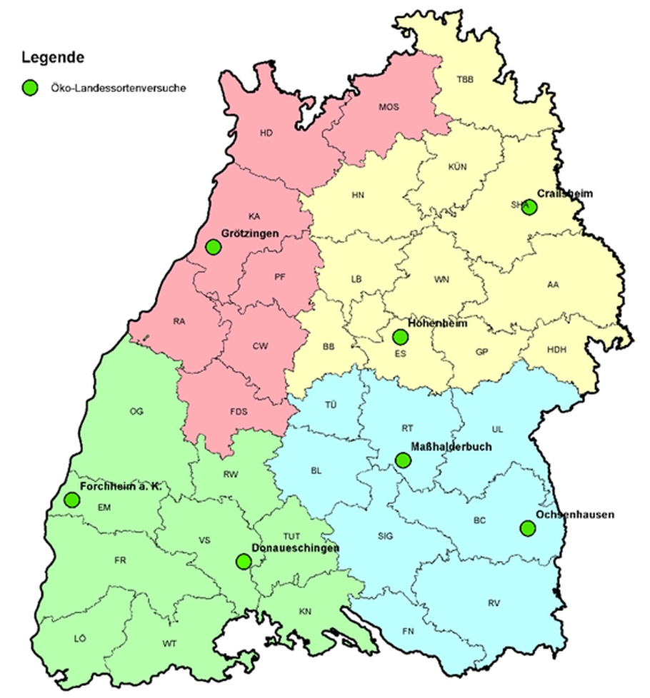 Ziel der Öko-Landessortenversuche ist, dem Öko-Landwirt oder der Öko-Landwirtin wichtige Informationen zur standortgerechten Sortenwahl an die Hand geben zu können. Je nach Standort können die Sorten unterschiedliche Ertrags- und Qualitätsmerkmale aufweisen, sodass folglich einzelne Sorten mehr und andere weniger gut für einen bestimmten Standort geeignet sein können. Um diese standortbedingten Unterschiede zu erfassen, sind die Versuchsstandorte der Landessortenversuche über die verschiedenen Naturräume des Landes Baden-Württembergs verteilt, welche ihrerseits durch verschiedene Faktoren wie beispielsweise das Klima, die Bodenart und Relief individuell geprägt sind. Die Öko-Landessortenversuche in Baden-Württemberg werden aktuell an insgesamt sieben verschiedenen Standorten durchgeführt (Abb. 1): Crailsheim, Karlsruhe-Grötzingen, Stuttgart-Hohenheim, Maßhalderbuch, Forchheim am Kaiserstuhl, Ochsenhausen und Donaueschingen (Kartoffeln). Da bereits die einzelnen Kulturen unterschiedlich für einen jeweiligen Standort geeignet sind, werden nicht alle Kulturen an allen Standorten getestet (Tab. 1).