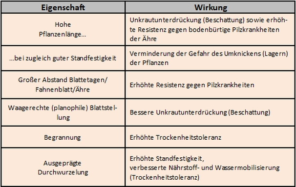 Im Ökologischen Landbau ist die Bekämpfung von Krankheiten, Schädlingen und Unkräutern mit chemisch synthetischen Pflanzenschutzmitteln sowie der Einsatz mineralischer Stickstoffdüngemittel nicht zulässig. Folglich werden geeignete Sorten benötigt, die auch ohne den Einsatz chemisch-synthetischer Betriebsmittel stabile Erträge erbringen. Entsprechend werden neben klassischen Ertrags- und Qualitätsmerkmalen eine Vielzahl zusätzlicher ackerbaulicher Kriterien, wie zum Beispiel die Resistenz gegenüber Krankheiten und die Unterdrückung von Beikräutern, untersucht. Dabei werden je nach untersuchter Kultur unterschiedliche Merkmale erfasst und geprüft. So werden beispielsweise beim Weizen Sorten mit einem hohen Kornertrag und einer guten Backqualität gewünscht, die zugleich auch für den ökologischen Anbau vorteilhafte ackerbauliche Eigenschaften, wie Standfestigkeit, Resistenzen gegenüber Krankheitserregern (z. B. Steinbrand, Gelbrost) und Trockenheit, sowie Auswuchs- oder Winterfestigkeit aufweisen. Dadurch können sich für den ökologischen Anbau geeignete Sorten in Ihrer Morphologie zum Teil deutlich von rein konventionellen Sorten unterscheiden. Im nachfolgenden Beispiel von Getreide werden einige der im ökologischen Landbau besonders relevanten morphologische Sortenmerkmale erläutert: