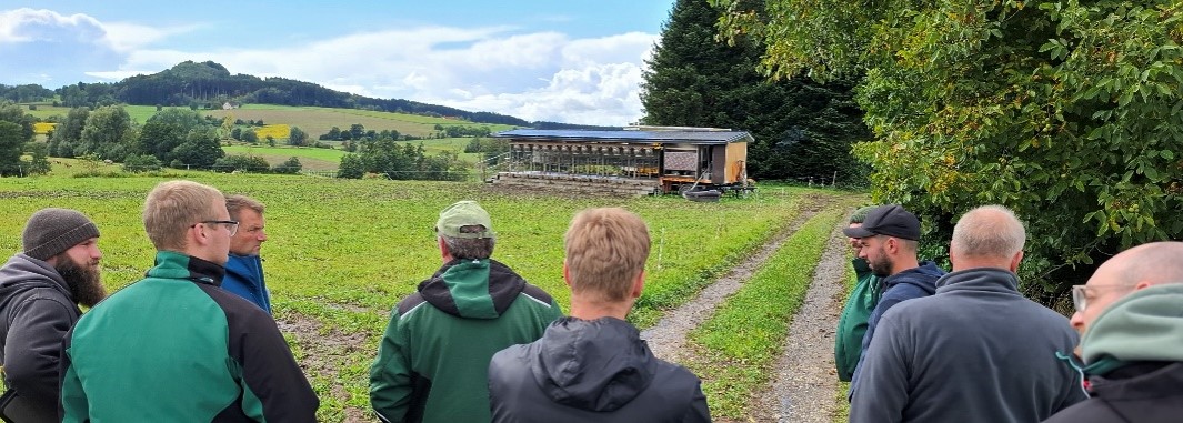 Im Rahmen netzwerkinterner Online- und Vor-Ort-Treffen wurde bereits im vergangenen Jahr deutlich, dass der zwischenbetriebliche Austausch gewünscht und geschätzt wird. Dabei bewegen die Betriebe unter anderem Fragen zur Erschließung von Weideflächen (insb. Querung öffentlicher Wege und Straßen), zum Umgang mit Trockenperioden, zur Tränkwasserversorgung der Tiere auf der Weide, zur Kombination von automatischem Melken und Weidegang und viele mehr. Der Wissenstransfer und Erfahrungsaustausch wird im Sinne des Projektziels in den noch anstehenden zwei Projektjahren über sogenannte „Weide-Schulen“ auf den Netzwerkbetrieben gefördert. Dabei sind sowohl alle interessierten Landwirtinnen und Landwirte wie auch Beratungskräfte eingeladen, detaillierte Einblicke in konkrete betriebliche Abläufe und Konzepte zu nehmen und in den fachlichen Austausch mit Berufskolleginnen und -kollegen zu kommen. Die erste Veranstaltung der Reihe fand im September auf dem Peter & Paul Hof in Uigendorf statt, der mit seinem ganzheitlichen Betriebskonzept unter anderem Lösungen zu Vollweidehaltung mit Weidemelken, Stallneubau mit optimaler Weideflächenanbindung, Weidegestaltung und Witterungsschutz mit Gehölzlauben und Agroforst sowie zur kuhgebundenen Kälberaufzucht demonstrieren konnte.