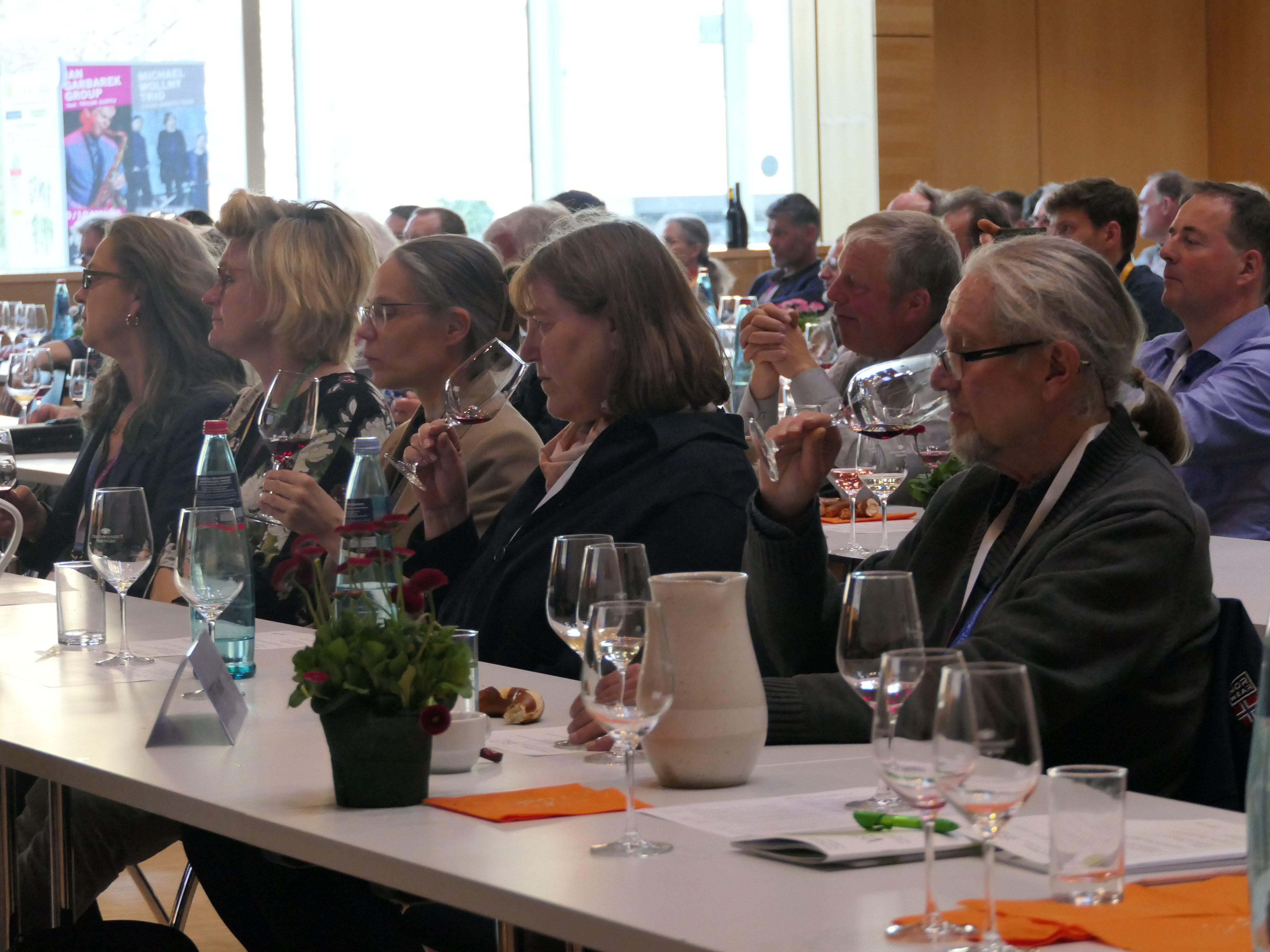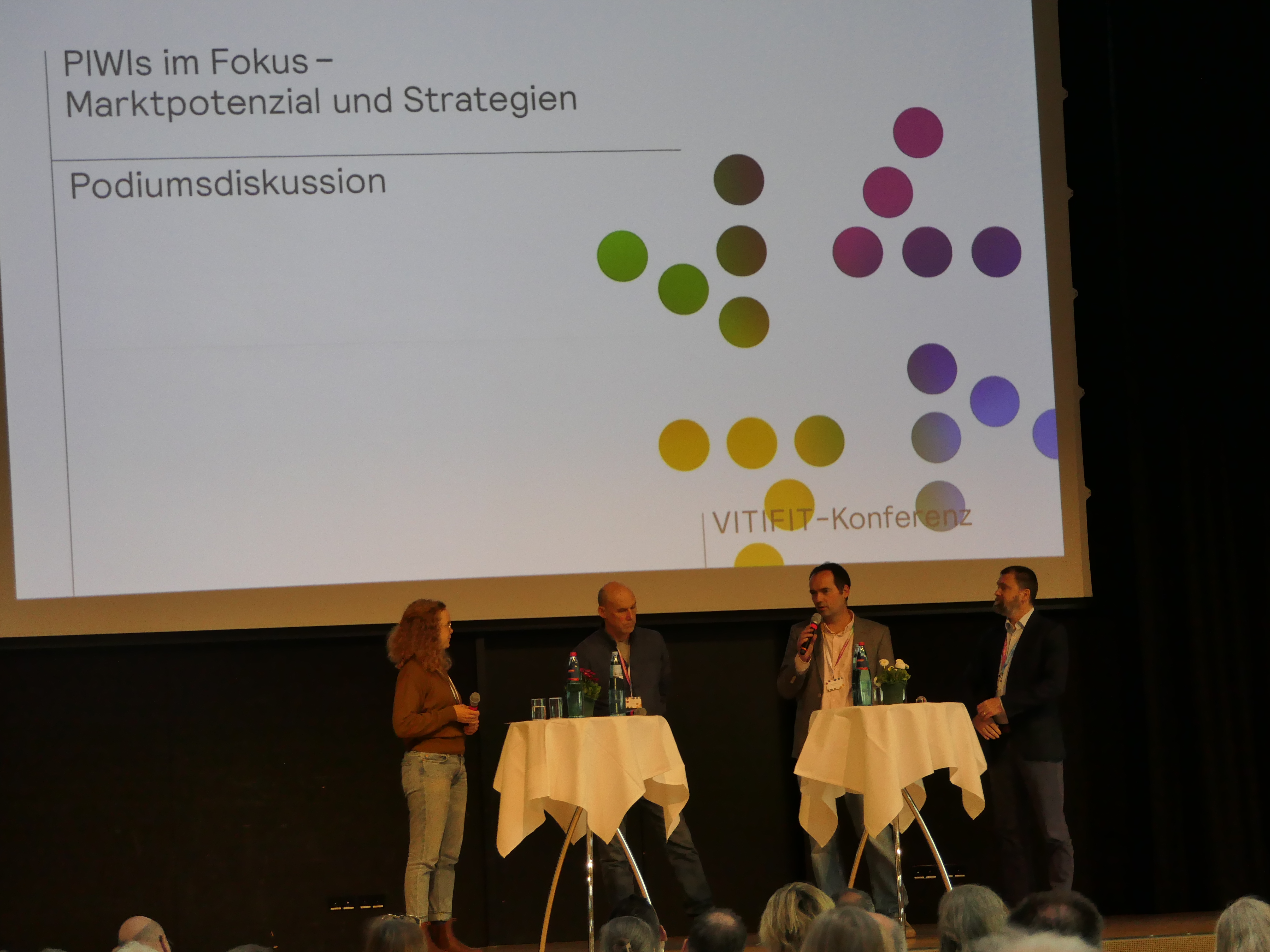 Der zweite Vortragsblock widmete sich der Vermarktung von Piwi-Weinen. Dr. Christoph Kiefer von der Hochschule Geisenheim (HGU) verdeutlichte, dass der Begriff Piwi bei über 80% der Konsumenten bisher nicht bekannt ist. Bestimmte Verbrauchergruppen wären aber durchaus bereit sich bewusst für diese Weine zu entscheiden und dafür etwas mehr Geld auszugeben, sofern ihnen die positiven Aspekte von Piwis bekannt wären. Eine Podiumsdiskussion mit dem Thema „PIWIs im Fokus – Marktpotenzial und Strategien“ moderiert von Nadine Poss (Bioland e.V.) rundete den Themenblock ab. Andreas Dilger (Winzer und Vorstandsvorsitzender PIWI Deutschland e.V.) und Martin Schmidt (Winzer, u.a. PIWI Kollektiv) teilten ihre Erfahrungen und Ansätze für eine erfolgreiche PIWI-Vermarktung mit dem Publikum. Ergänzt wurden sie dabei von Prof. Gergely Szolnoki (HGU), welcher neueste Ergebnisse aus der Konsumentenanalyse aufzeigte. Weine aus Piwis sind laut derer Erfahrung durchaus in der Lage neue Verbraucherschichten zu erreichen. Gerade umweltbewusste, eher junge Konsumenten, welche aus Gesundheitsaspekten eher auf Alkohol verzichten, könnten mit dem Thema Nachhaltigkeit angesprochen werden. Prof. Ulrich Fischer (DLR) rundete den ersten Tag mit einer unterhaltsamen Weinprobe mit dem Titel „Pioniere der Piwi-Weine“ ab. Bereits zuvor hatte er europäische Verbraucherpräferenzen aus Konsumentenstudien und die önologischen Besonderheiten von unterschiedlichen Piwi-Weine im Keller präsentiert. Den prickelnden Beginn der Verkostung machte ein entalkoholisierter Schaumwein, gefolgt von einem Crémant. Anschließend wurden sowohl leichte und fruchtige Weine für den Alltag, Raritäten wie Orangewein sowie Rotweine aus dem Premiumsegment präsentiert und verkostet. So zeigte sich, dass wenn die notwendige Erfahrung im Umgang mit den Rebsorten erst einmal vorhanden ist, Piwi-Weine hinsichtlich Vielfalt und Qualität ihren traditionellen Vertretern in nichts nachstehen.