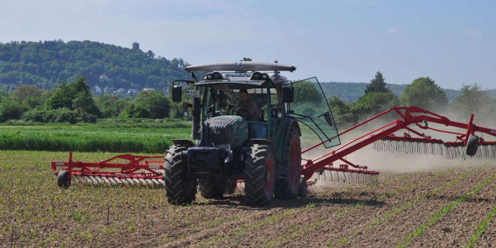 Versuchsfeld Grötzingen, Striegel im Einsatz; im Hintergrund: Turmberg