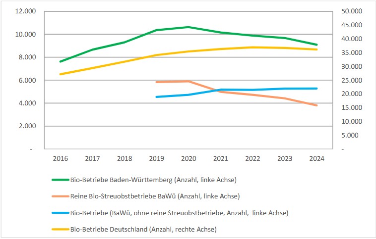 Hier ist allerdings die Besonderheit der zahlreichen Bio-Streuobstbetriebe in Baden-Württemberg zu berücksichtigen. Diese oft sehr kleinen Betriebe scheiden aus verschiedenen Gründen aus der Bio-Zertifizierung aus (Aufgabe, Generationswechsel) und verfälschen das Gesamtbild. Bereinigt um die reinen Streuobstbetriebe wächst die Zahl der Bio-Betriebe seit 2019 um rund 15 % (LEL Schwäbisch Gmünd, 2025).