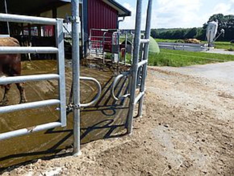 Bild 1: Weideselektionstor (im Hintergrund) zur Steuerung des Weidezugangs über das Melkanrecht am automatischen Melksystem. Im Vordergrund Einwegtor zur freien Rückkehr der Kühe von der Weide in den Stall.